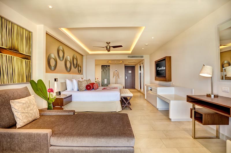 HIDEAWAY at Royalton Riviera CancunRomantically decorated Honeymoon Suite with 1 King Bed. Full bathroom with separated toilet, 2 washbowls and indoor Jacuzzi. Balcony with magnificent views of the ocean. Max Occupancy: 2 Adults.